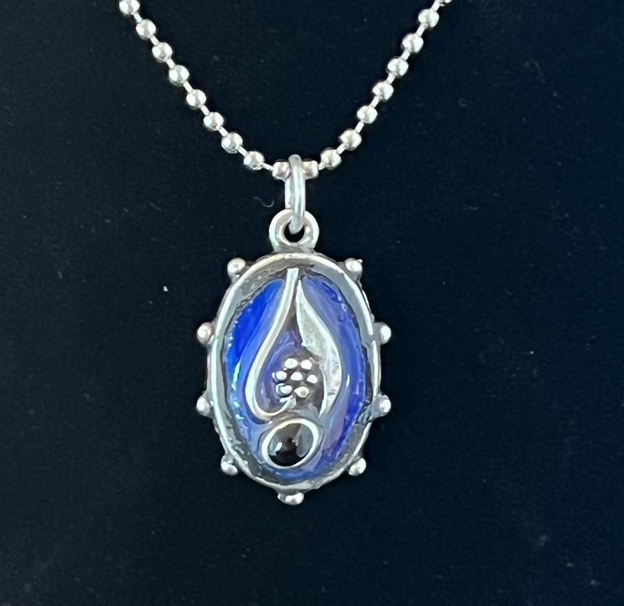 Silver-tone design with black stone on blue glass in silver-tone bezel. 1 inch x .5 inches. Shown with silver tone ball chain necklace. Can substitute black cord or elastic.